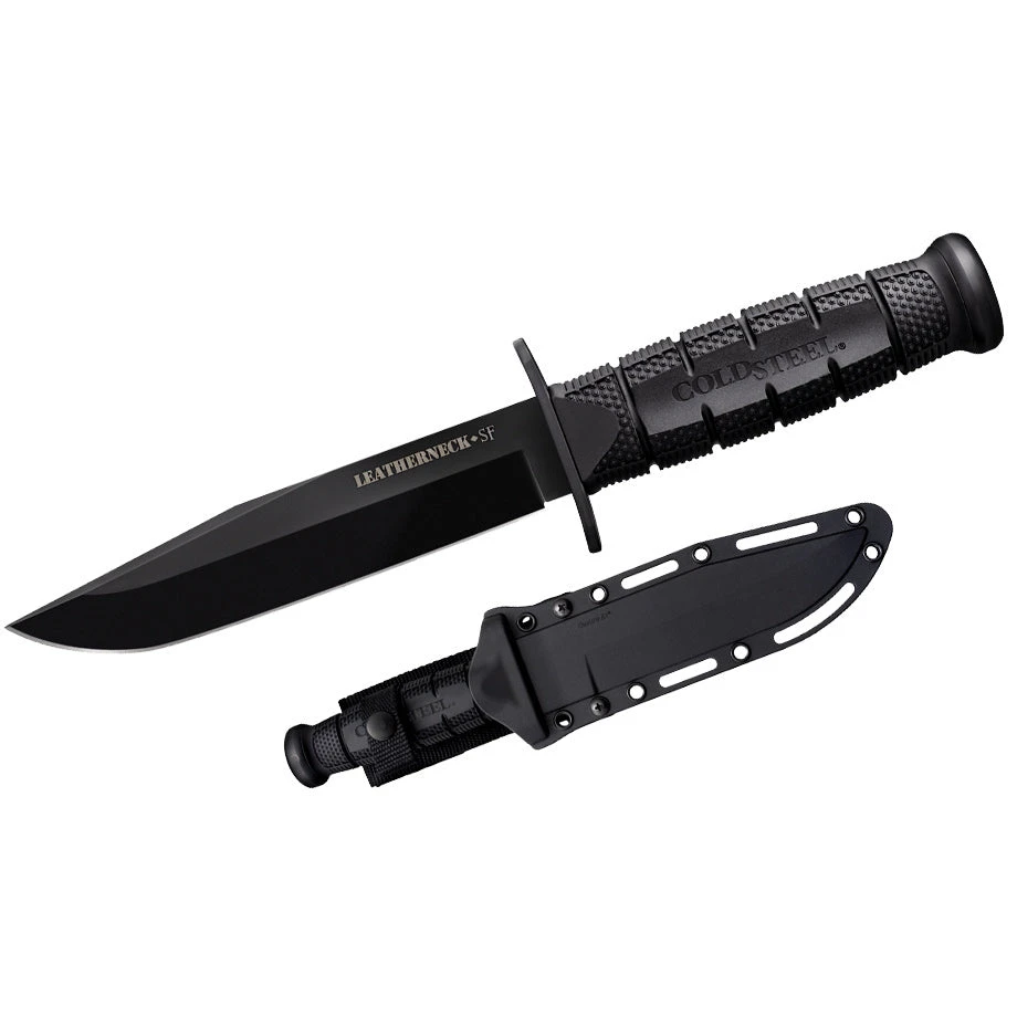The Cold Steel Leatherneck Series is comprised of two distinct and iconic blade styles, both of which have proven to be exceptionally popular with our brothers and sisters in the armed forces: The Leatherneck-SF (for Semper-Fi) has a beautiful hand honed saber ground clip point blade, and the Leatherneck Tanto features our signature Cold Steel “American Tanto” blade with a stout reinforced tip for extra strength. Both are made from tough D2 Tool Steel with a non-reflective black powder coat finish. To keep the user’s fingers from sliding forward onto their keen edge, the Leathernecks come with a solid steel double quillon guard. The handles are made of deeply checkered Kray-Ex™ that totally encompasses the Leathernecks extra wide, full tang. The Leatherneck’s handle is capped with a thick, machined steel butt cap (not cheap casting or plastic like some others on the market) so they can even double as a hammer in an emergency! To carry the Leatherneck knives safely and conveniently, each blade comes complete with a sturdy and versatile military style Secure-Ex® sheath with fully detachable and ambidextrous belt loop.